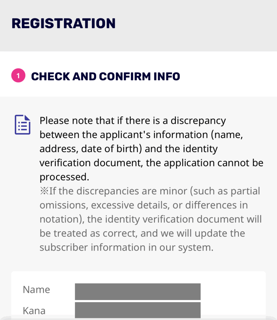 원하는 요금제와 Hulu와 같은 옵션 계약을 선택한 후에는 가입자 정보가 표시됩니다. 본인 확인 서류와 가입자 정보(라쿠텐 회원 정보)가 일치하는지 확인하신 후 진행해 주십시오. 결혼 등으로 성이 변경된 경우에는 신청 전에 회원 정보를 업데이트해 주십시오.