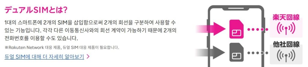지금 사용 중인 스마트폰으로 그대로 라쿠텐 모바일 통신을 시험해 보고 싶은 분께는 “듀얼 SIM” 활용을 추천합니다. 듀얼 SIM이란 한 대의 스마트폰에 2개의 SIM(물리 SIM+eSIM, 또는 eSIM+eSIM 등)을 설정해 회선을 필요에 따라 나눠 쓰는 방식입니다.