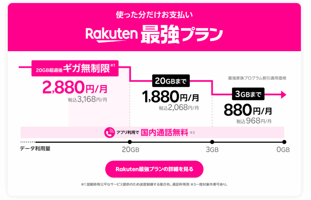 ①Rakuten最強プラン(通話・データ使い放題のベーシックプラン)