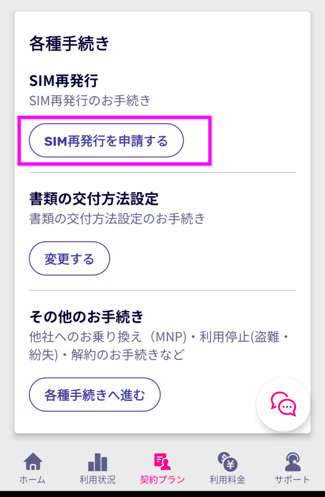「各種手続き」から 「SIM再発行を申請する」 をタップします。