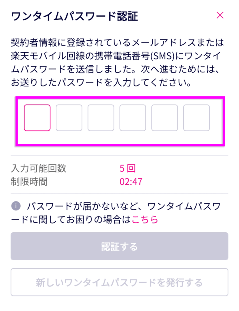 SMSで届いた ワンタイムパスワード(OTP) を入力し、「認証する」 をタップします。