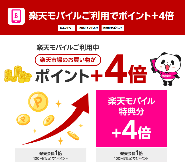 これらを合わせると、通常ポイント1倍 + 楽天モバイル関連で最大4倍 = 合計最大5倍 のポイントを獲得できます!