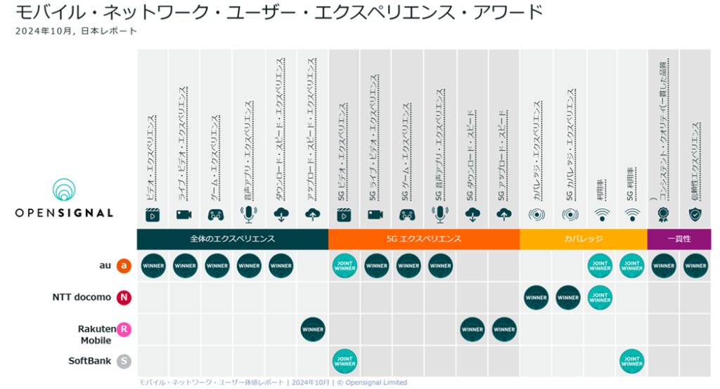 「モバイル・ネットワーク・ユーザー体感レポート(2024年10月)」: https://www.opensignal.com/jp/reports/2024/10/japan/mobile-network-experience