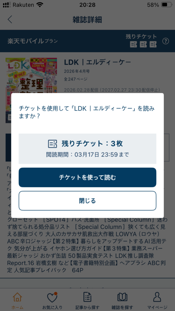 「チケットを使って読む」ボタンを押すと、保有していたチケット枚数が1個減ります。チケットを使った雑誌「LDK | エルディーケー」の閲読期限は7日後の23:59までと表示されました。