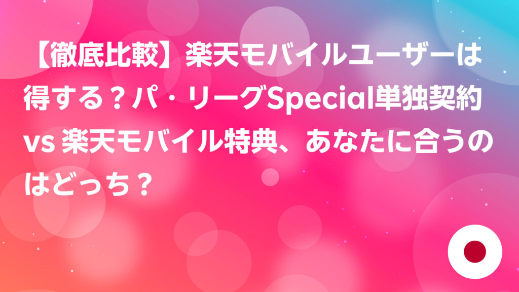 ※ 本記事の情報は2026年4月時点のものです。パ・リーグSpecialのサービス内容、料金、楽天モバイル特典の条件は変更される可能性があります。必ずパ・リーグSpecialおよび楽天モバイルの公式サイトで最新情報をご確認ください。