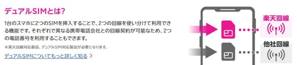 今お使いのスマートフォンで、そのまま楽天モバイルの通信を試したい方には、「デュアルSIM」の活用がおすすめです。デュアルSIMとは、1台のスマホに2つのSIM(物理SIM+eSIM、またはeSIM+eSIMなど)を設定し、回線を使い分けられる仕組みです。