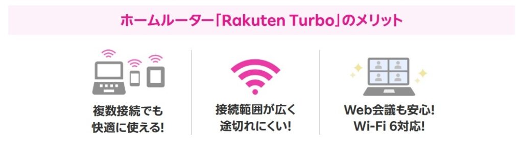 自宅のインターネットを「すぐ使いたい」「工事は避けたい」「動画や在宅ワークも快適にしたい」——そんな方におすすめなのが、ホームルーターのRakuten Turboです。簡単にWi-Fi環境を用意でき、さらに楽天モバイルと組み合わせて「最強おうちプログラム」を活用すると、ポイント還元で毎月の負担を抑えながら、自宅のネット環境を整えられます。