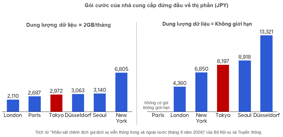 Trước đây, giá cước điện thoại di động của Nhật Bản được cho là cao so với các nước khác. Kể từ khi Rakuten Mobile tham gia thị trường với tư cách là nhà mạng di động thứ tư (MNO) vào năm 2020, các công ty khác cũng đã đưa ra các gói cước rẻ hơn, và giá cước điện thoại di động của Nhật Bản đã giảm. Theo cuộc khảo sát do Bộ Nội vụ và Truyền thông thực hiện vào tháng 3 năm 2024, mức giá cước của Nhật Bản hiện đang ở mức trung bình so với các thành phố lớn ở nước ngoài. Biểu đồ dưới đây so sánh các gói cước 2GB và không giới hạn của nhà cung cấp có thị phần lớn nhất, nhưng ngay cả khi so sánh các gói cước và nhà cung cấp khác, Nhật Bản cũng đạt mức trung bình.