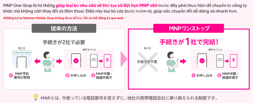 Bằng cách sử dụng phương pháp MNP One-Stop, việc chuyển đổi sang Rakuten Mobile trở nên cực kỳ dễ dàng. Bạn không còn cần đến những thủ tục phiền phức như trước nữa.