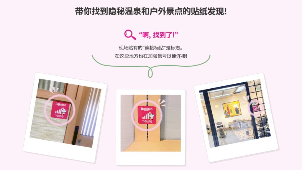 我们将介绍日本各地乐天移动“能连上”的秘汤、露营地等户外景点。现场张贴的“连接标贴”就是标识。欢迎在社交媒体通过话题标签「#发现RakutenMobile贴纸」确认这些“能连上”的地点;当您发现贴纸时,也请务必带上话题「#发现RakutenMobile贴纸」一起发布分享!
